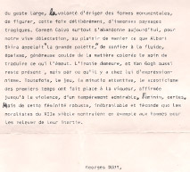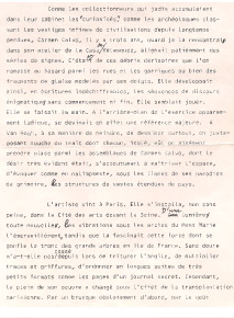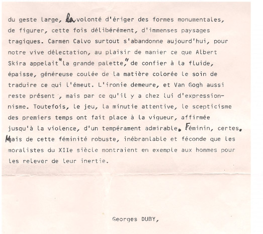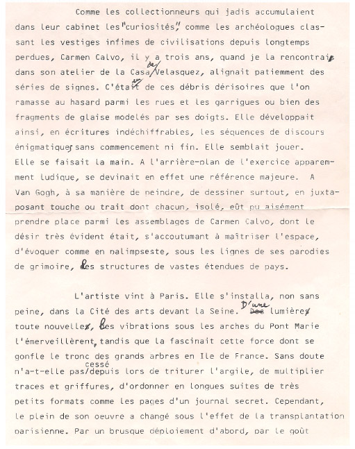 "Como los coleccionistas que antaño acumulaban “curiosidades” en sus almacenes, como los arqueólogos que clasificaban los ínfimos vestigios de las civilizaciones, Carmen Calvo, tres años atrás, cuando la conocí en su taller de la Casa de Velazquez, sumaba pacientemente series de signos. Se trataba de esos restos insignificantes que se pueden recoger ocasionalmente en la calle o de fragmentos de arcilla modelados por sus propios dedos. De este modo iba desarrollando, en escrituras indescifrables, secuencias de discursos enigmáticos sin principio ni fin. Daba la impresión de estar jugando. Cada vez dominaba mejor la mano. Pero en el trasfondo del ejercicio aparentemente lúdico, se adivinaba, en efecto, una referencia esencial. A Van Gogh, a su manera de pintar, de dibujar sobre todo, yuxtaponiendo pincelada o rasgo, cada uno de los cuales, aislado, podía fácilmente participar de los conjuntos de Carmen Calvo, cuyo más nítido deseo era, mientras se acostumbraba a dominar el espacio, el de evocar, como en un palimpsesto, tras las lineas de esas parodias de libros indescifrables, las estructuras de enormes extensiones de la tierra.